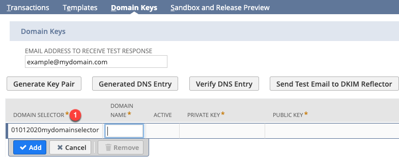 5. Set value for Domain Selector. Recommended naming convention is to use [DDMMYYYY][Company Name][selector]. In our example, we will use the value of 01012020mydomainselector.