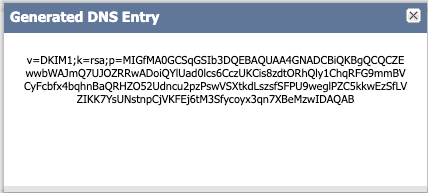 8. While you are on the line, click Generate DNS Entry button. Once clicked, you will see popup window with generated DNS Entry. COPY the entire string and set it aside. You will need this value to create new DNS Entry in your domain provider.