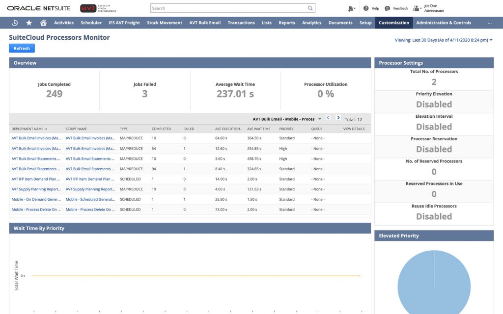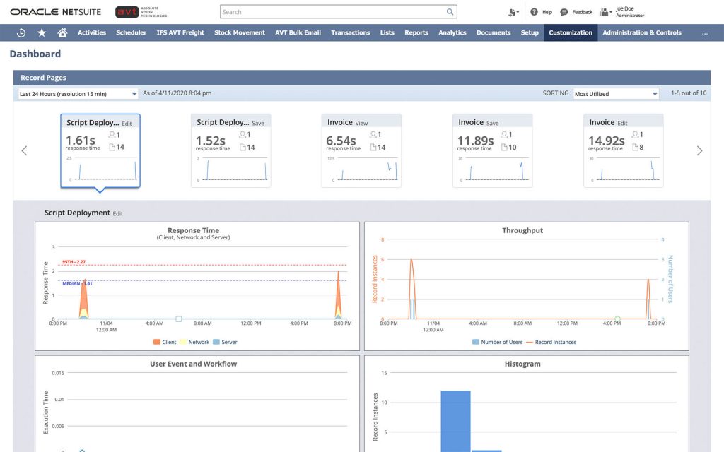 The Application Performance Management (APM) SuiteApp enables you to see and manage the performance of your NetSuite customizations and business critical operations. You can use the dashboard, data visualizations, page time summary, script analysis, and script queue monitor to review and improve the speed of the NetSuite UI.