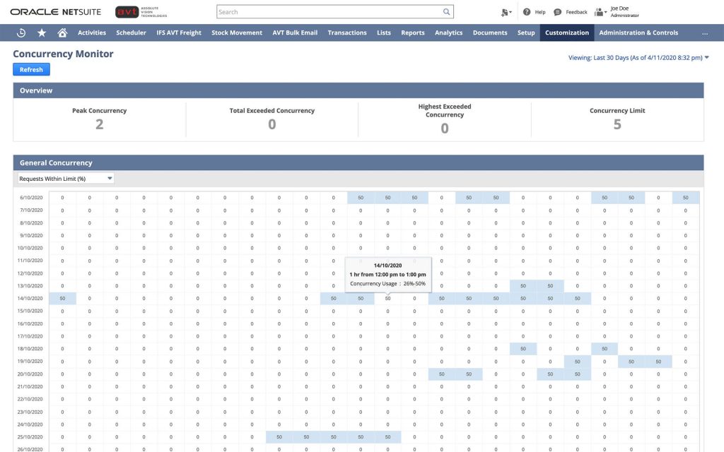 10. Concurrency Monitor: Concurrency Monitor tool is used to analyze the performance of web services and RESTlet integrations. The tool includes dashboards that lets you view critical data about your concurrent requests and limits.