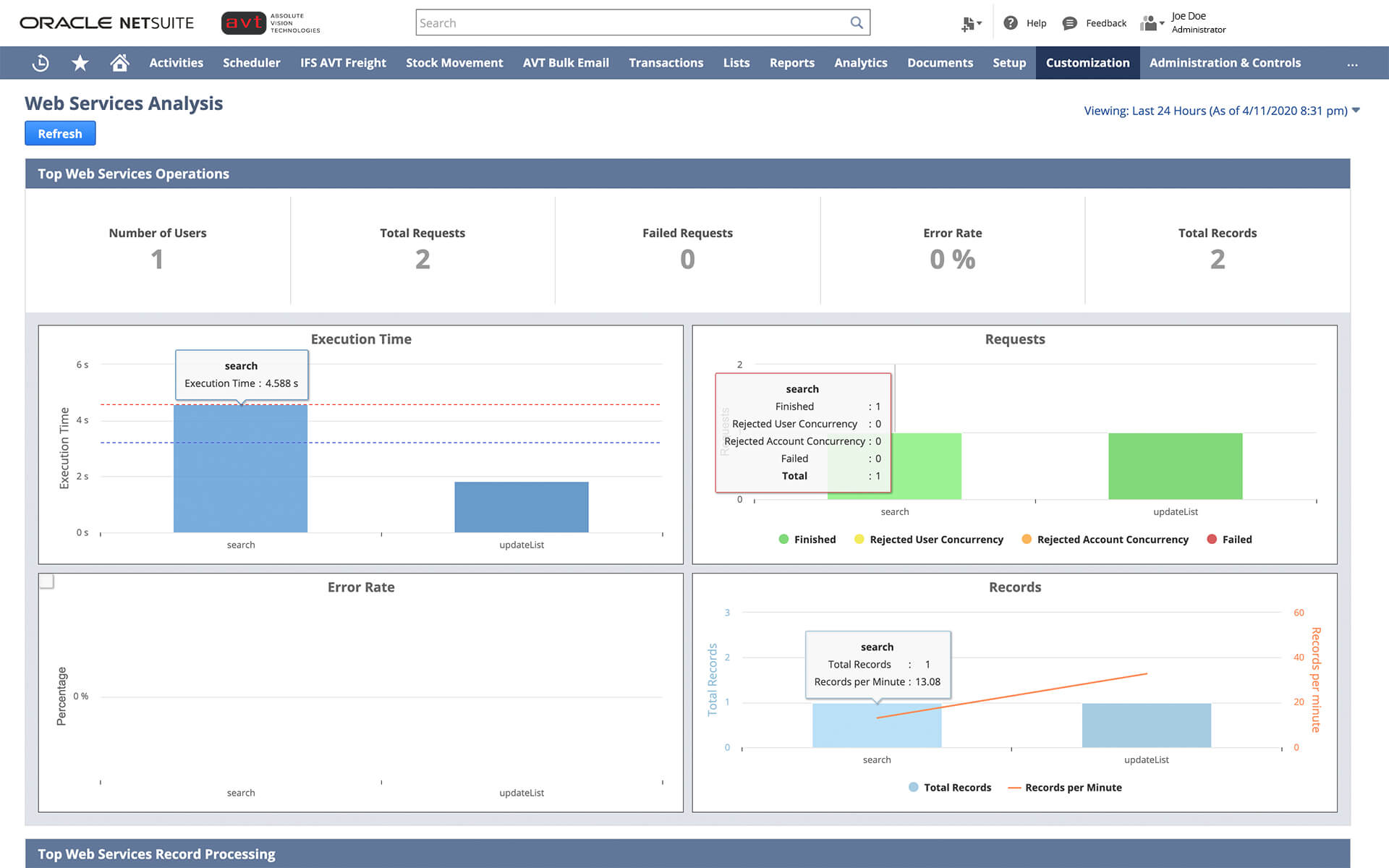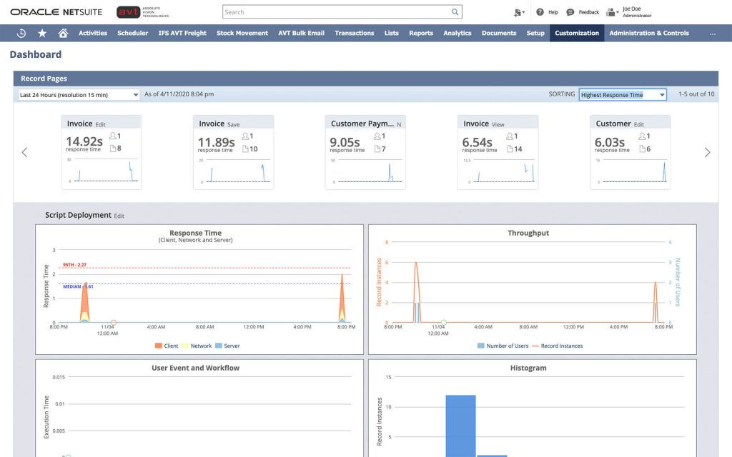 - Monitor performance of user event scripts, workflows, RESTlets, scheduled scripts, and Suitelets.